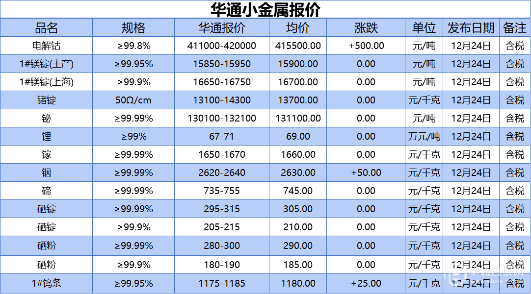 华通白银网 12月24日讯:电解钴、1#镁锭(生产)、1#镁锭(上海)、锗锭、铋、锂、镓、铟、碲、硒锭(99.99%)、硒锭(99.9%)、硒粉、硒粉(99.9%)、1#钨条报价