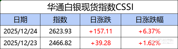 华通白银现货指数CSSI走势日报,今日指数2623.93,日涨跌+157.11,日涨跌幅+6.37%