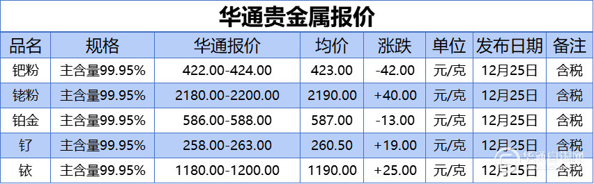 华通白银网 12月25日讯:钯粉、铑粉、铂金、钌、铱报价