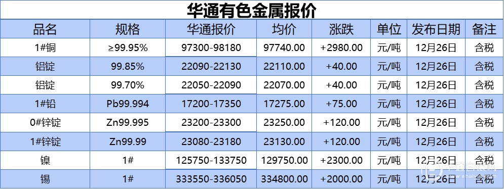 华通白银网 12月23日讯:1#、铝锭(99.85%)、铝锭(99.70%)、1#铅、1#、0#锌、镍、锡报价