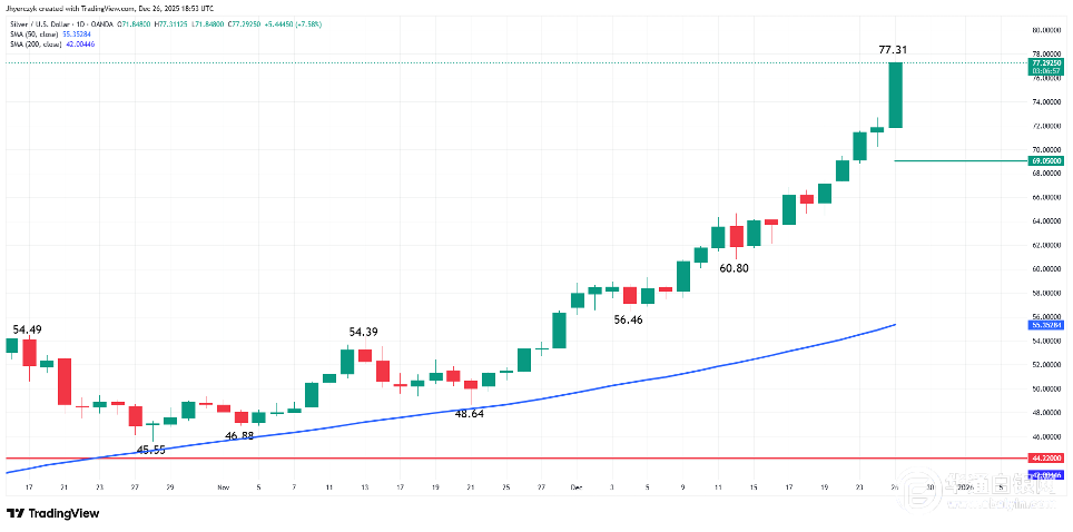自11月21日触及48.64美元低点以来,白银已累计上涨超过28.67美元。鉴于当前强劲的上涨动能,投机者似乎正意图提前挑战2026年100美元或更高的目标价位。