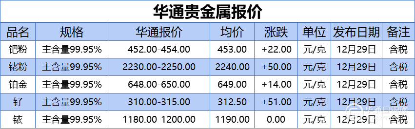华通白银网 12月29日讯:钯粉、铑粉、铂金、钌、铱报价