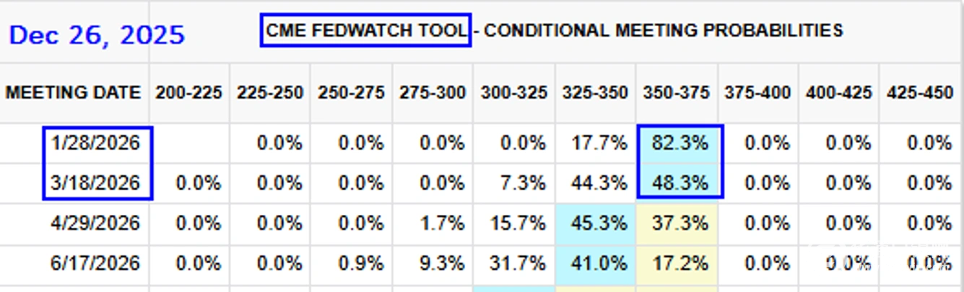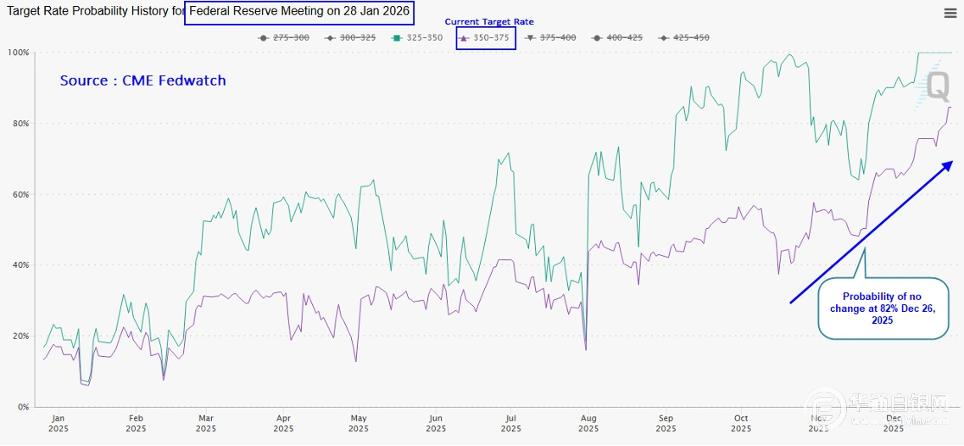 芝加哥商品交易所的美联储观察工具显示,1月不加息的可能性从2025年12月23日的86.7%上升至82.3%。