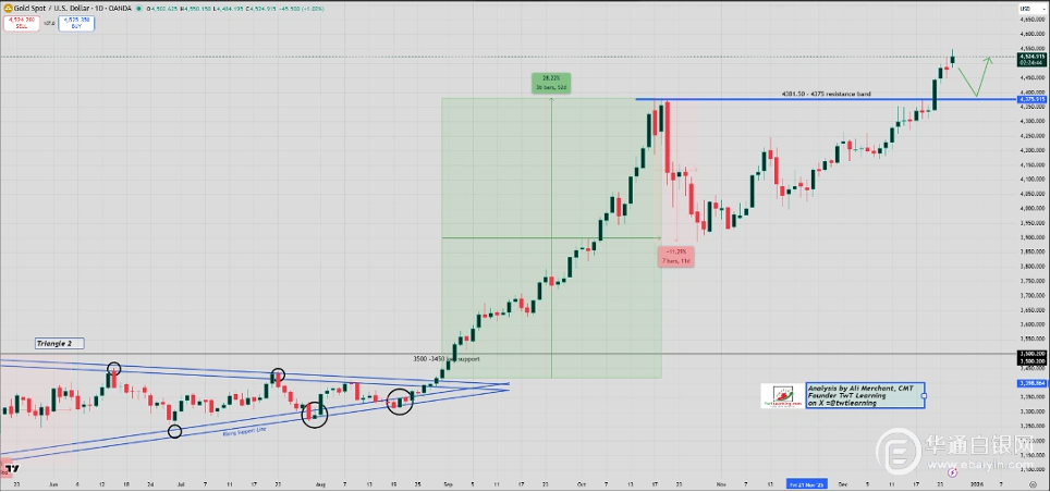 【华通白银网12月29日】金价上周五飙升至纪录新高,因投资者在地缘政治紧张局势升温和美元走软之际转向避险资产,延续了贵金属年底的强劲涨势。现货黄金攀升约1%至4,522.50美元/盎司,徘徊在稍早创下的盘中新高4,550.15美元/盎司下方。