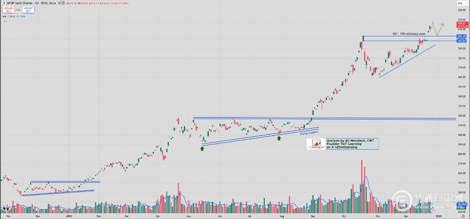 GLD今天创下418.45的历史新高,之后有所回落。回调至403-398区域可能会巩固支撑,然后再走高,作为健康上升趋势的一部分。价格走势似乎非常紧张。在未来一周假日交易清淡的情况下,该ETF可能会在本月、季度和年底出现获利回吐。