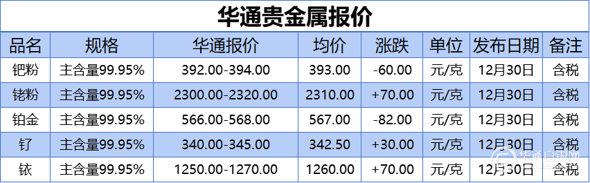 华通白银网 12月30日讯:钯粉、铑粉、铂金、钌、铱报价