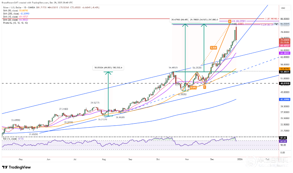 83.40美元与84.00美元附近存在两大长期指标的阻力。白银价格在周一触及84.03美元后出现的明显看跌反应,证实了该阻力区域的有效性。这两个目标位均为扩展测量位,提示价格已过度延伸:其一是10月下跌修正浪的423.6%(261.8%+161.8%)扩展位83.40美元;其二是上升ABCD形态的400%投射位84.00美元,与实际高点高度吻合。两大指标共振区域出现的抛售迹象表明,牛市趋势至少将进入休整阶段,甚至可能展开显著回调。
