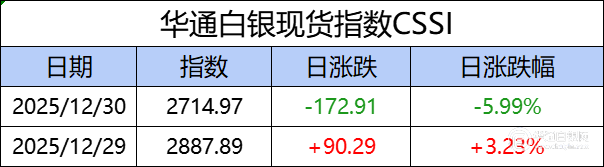 华通白银现货指数CSSI走势日报,今日指数2714.97,日涨跌-172.91,日涨跌幅-5.99%