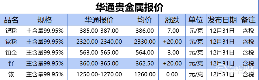 华通白银网 12月31日讯:钯粉、铑粉、铂金、钌、铱报价
