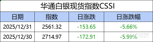 华通白银现货指数CSSI走势日报,今日指数2561.32,日涨跌-153.65,日涨跌幅-5.66%
