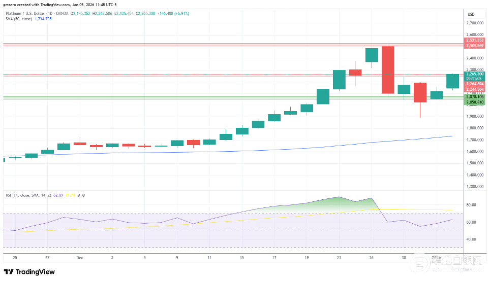 铂金测试2245-2265美元阻力位,因贵金属需求强劲。