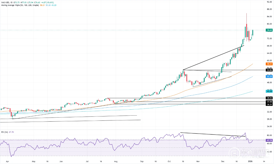 【华通白银网1月6日】•随着委内瑞拉领导层动荡刺激对硬资产对冲的需求,银价飙升至76美元附近。