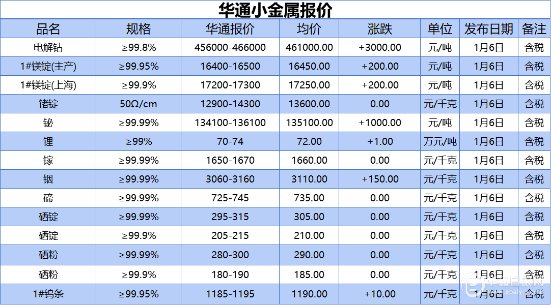 华通白银网 1月6日讯:电解钴、1#镁锭(生产)、1#镁锭(上海)、锗锭、铋、锂、镓、铟、碲、硒锭(99.99%)、硒锭(99.9%)、硒粉、硒粉(99.9%)、1#钨条报价