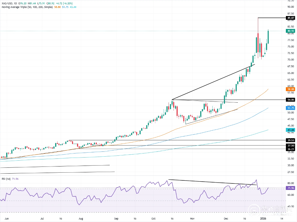 银价持续呈直线式上涨,周二涨幅超5%,尽管美国国债收益率上升且美元走强,但白银价格仍高于80美元/盎司水平。
