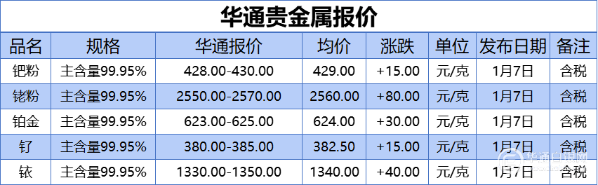 华通白银网 1月7日讯:钯粉、铑粉、铂金、钌、铱报价
