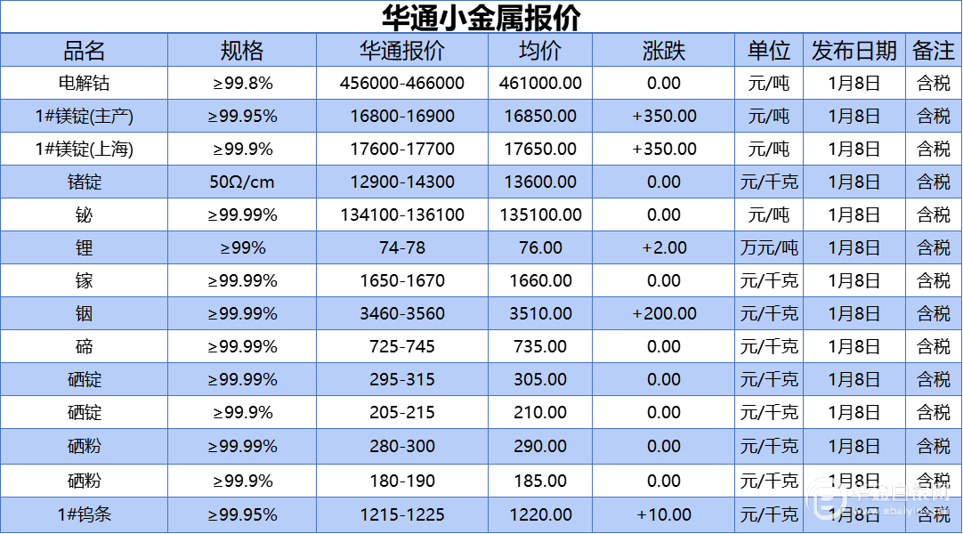 华通白银网 1月8日讯:电解钴、1#镁锭(生产)、1#镁锭(上海)、锗锭、铋、锂、镓、铟、碲、硒锭(99.99%)、硒锭(99.9%)、硒粉、硒粉(99.9%)、1#钨条报价
