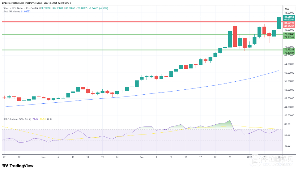 如果白银收于阻力位83.50美元-84.00美元上方,则将向88.00美元移动。