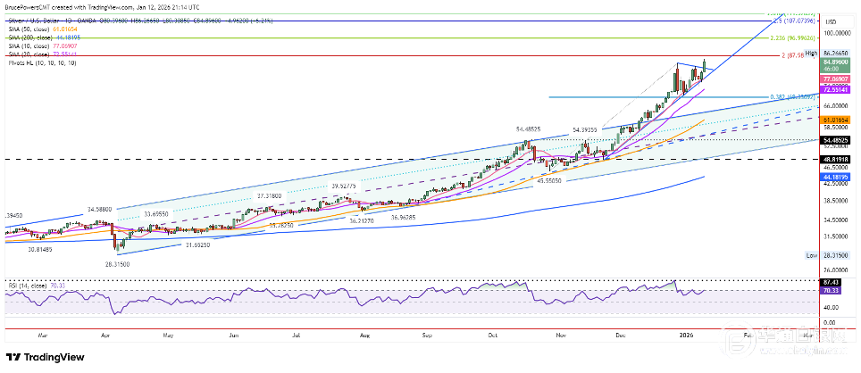 周一,白银价格突破86.27美元的历史新高,表明多头重新掌握了主动权。截至撰写本文时,银价创下了更高的日低点80.31美元,这是目前的近期支撑位。除了将上涨趋势延伸至先前的高点84.03美元上方外,该上涨还以突破日线图上的看涨盘整格局开始,该格局在10日移动均线的支撑位附近形成,并接近10周以来的趋势高点。
