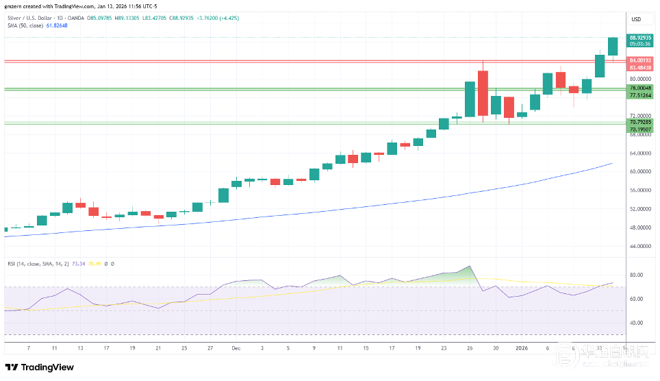突破89.00美元将推动银价向重要的心理关口90.00美元挺进。