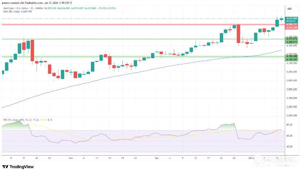 【华通白银网1月14日】•黄金成功收于4600美元/盎司上方。