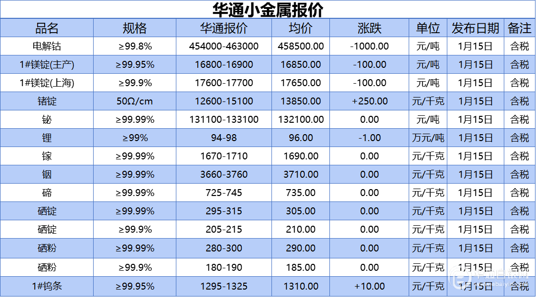 华通白银网 1月15日讯:电解钴、1#镁锭(生产)、1#镁锭(上海)、锗锭、铋、锂、镓、铟、碲、硒锭(99.99%)、硒锭(99.9%)、硒粉、硒粉(99.9%)、1#钨条报价