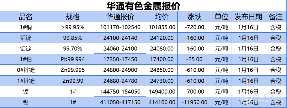 华通白银网 1月16日讯:1#铜、铝锭(99.85%)、铝锭(99.70%)、1#铅、1#锌、0#锌、镍、锡报价