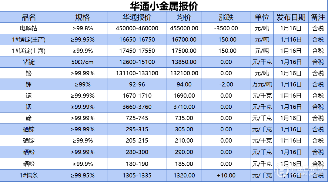 华通白银网 1月16日讯:电解钴、1#镁锭(生产)、1#镁锭(上海)、锗锭、铋、锂、镓、铟、碲、硒锭(99.99%)、硒锭(99.9%)、硒粉、硒粉(99.9%)、1#钨条报价