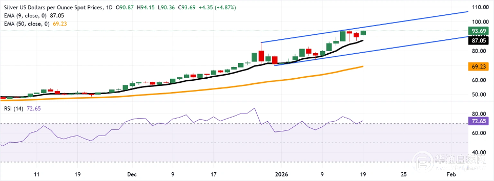 【华通白银网1月19日】•周一,白银价格达到94.15美元的历史新高。