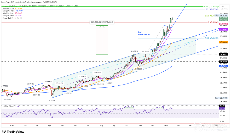 从价格测量角度计算,目标位约在112.32美元附近;若以百分比涨幅测算,上行潜在目标则可看至127.63美元。关键在于,基于当前趋势形态表明白银仍具上涨潜力。无论这些测量目标是否最终达成,它们均反映出市场买盘需求的持续强劲。