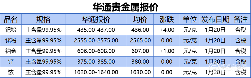 华通白银网 1月20日讯:钯粉、铑粉、铂金、钌、铱报价