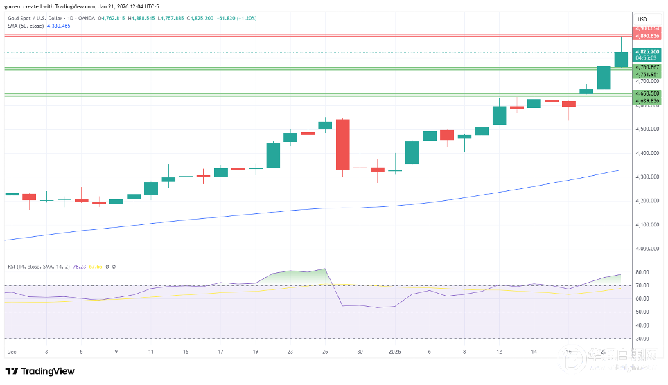 如果黄金能够突破4890至4900美元阻力位,则将朝着重要心理水平5000美元价位迈进。