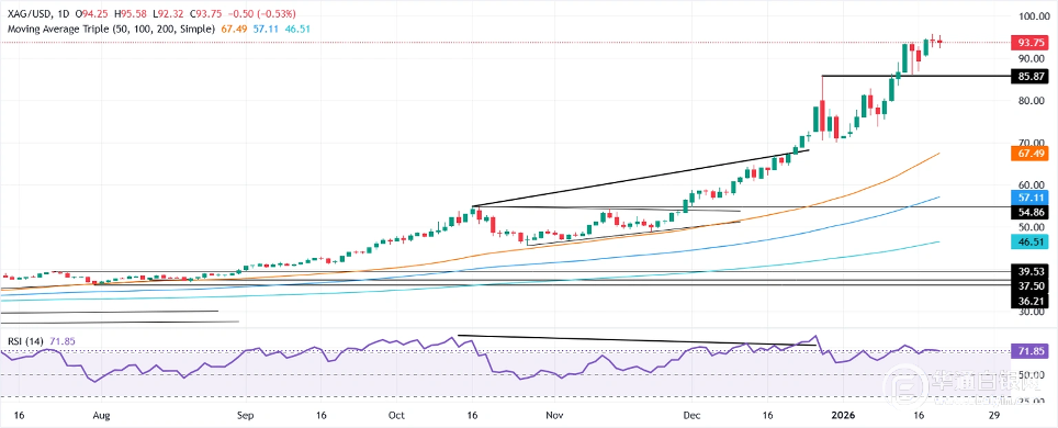 白银价格周三出现回调,此前其曾达到日高点95.56美元,因美国总统特朗普在达沃斯演讲中缓和了语气,表示他准备与丹麦就格陵兰岛问题进行谈判。截至撰写本文时,白银的交易价格为93.57美元,较周二创下的95.89美元的历史高点下跌了超过1%。