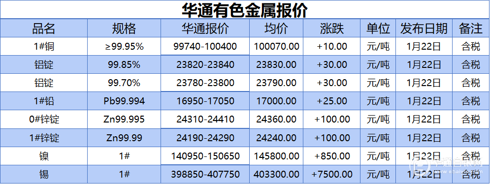华通白银网 1月22日讯:1#铜、铝锭(99.85%)、铝锭(99.70%)、1#铅、1#锌、0#锌、镍、锡报价