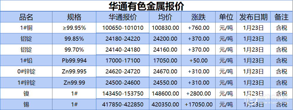 华通白银网 1月23日讯:1#铜、铝锭(99.85%)、铝锭(99.70%)、1#铅、1#锌、0#锌、镍、锡报价