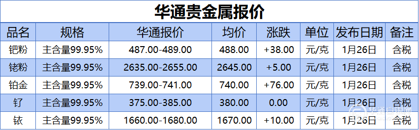 华通白银网 1月26日讯:钯粉、铑粉、铂金、钌、铱报价