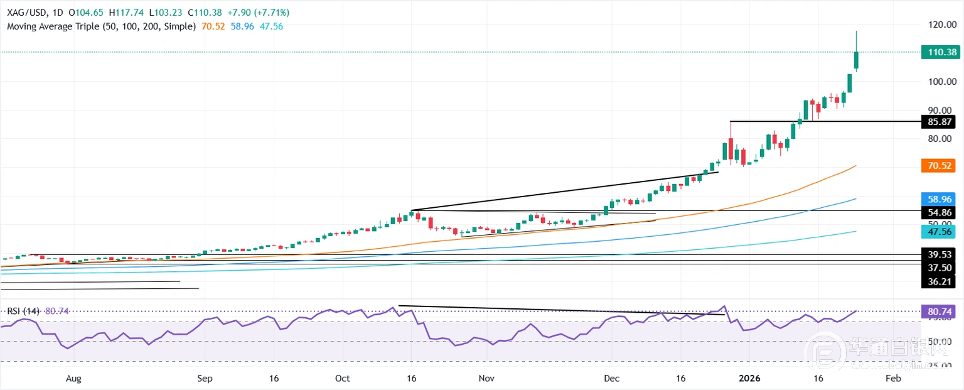 如果白银价格突破120美元/盎司,则将为挑战130美元水平打开大门。若银价进一步上涨,下一个目标将是150美元。反之,初步支撑位在100美元。若跌破100美元,那么下一支撑区间将是1月23日的日低点96.14美元,之后白银将向90美元区域回落。