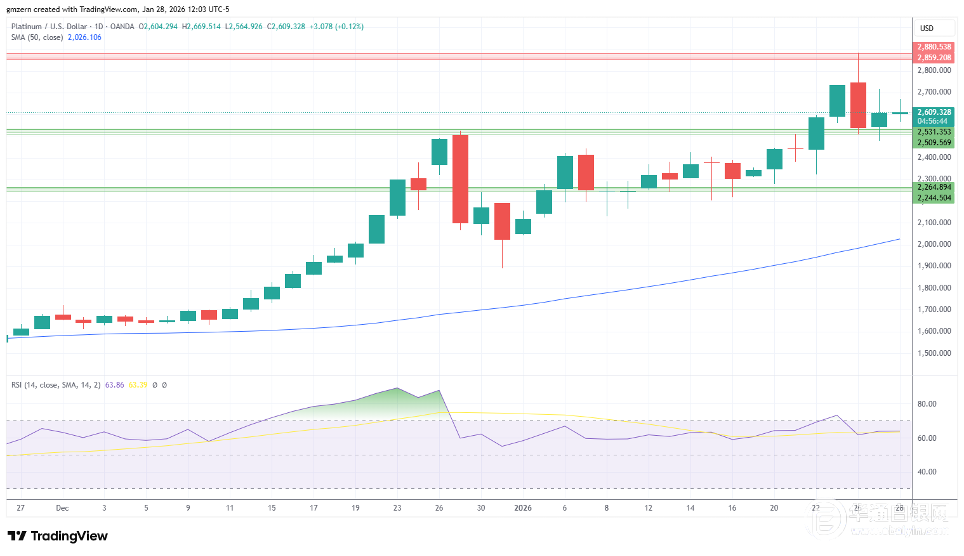 如果铂金价格回升至2700美元上方,则将会向2860至2880美元阻力位移动。
