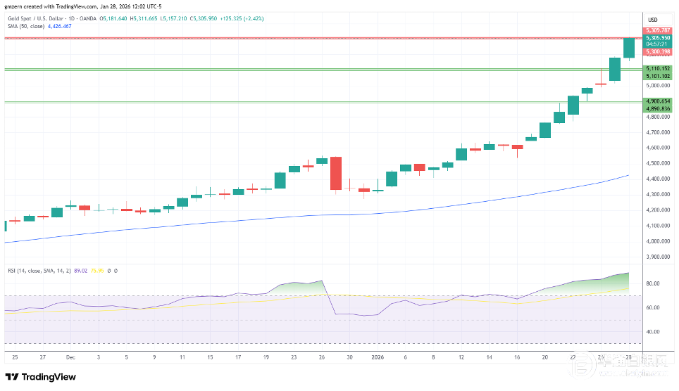 【华通白银网1月29日讯】•黄金试图稳定在5300-5310美元阻力位上方。