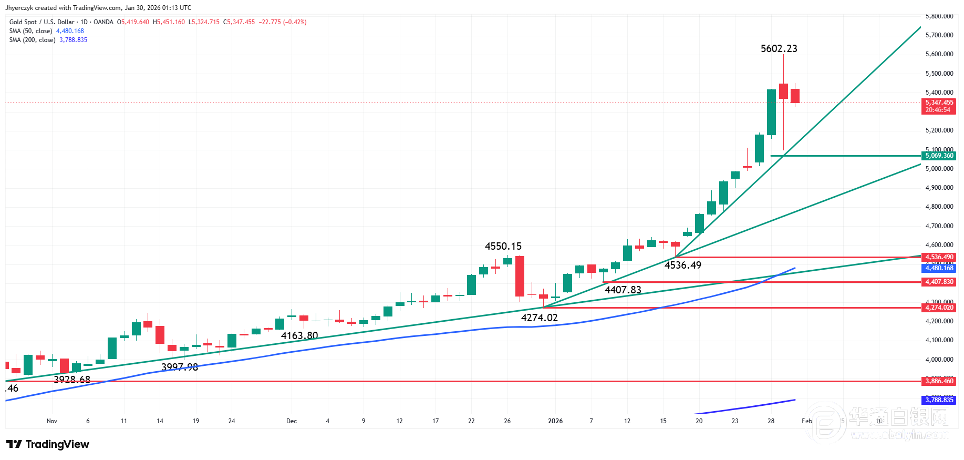 周四,由于获利了结,黄金价格暴跌超5%,随后触及5602.23美元的历史高位。在下跌过程中,白银价格也跟随下跌,一度逼近趋势线50%水平的支撑区域。