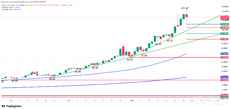 【华通白银网1月30日讯】•银价创下历史新高至121.67美元后出现回落,随后形成收盘价反转形态,预示着未来可能有回调。
