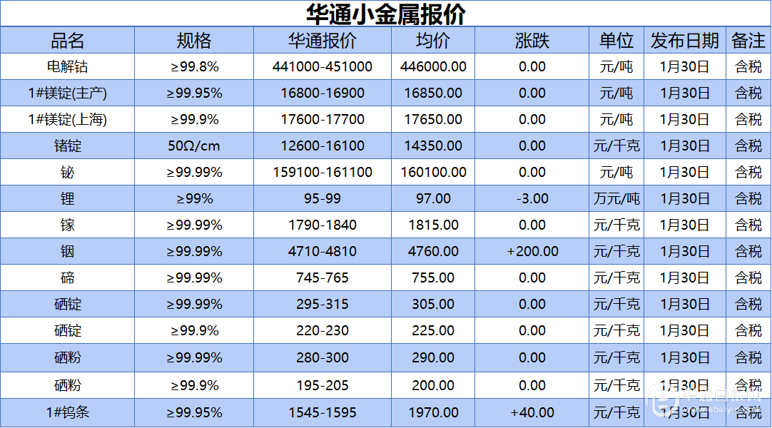 华通白银网 1月30日讯:电解钴、1#镁锭(生产)、1#镁锭(上海)、锗锭、铋、锂、镓、铟、碲、硒锭(99.99%)、硒锭(99.9%)、硒粉、硒粉(99.9%)、1#钨条报价