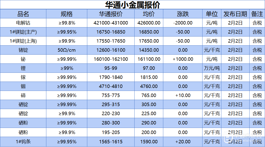 华通白银网 2月2日讯:电解钴、1#镁锭(生产)、1#镁锭(上海)、锗锭、铋、锂、镓、铟、碲、硒锭(99.99%)、硒锭(99.9%)、硒粉、硒粉(99.9%)、1#钨条报价