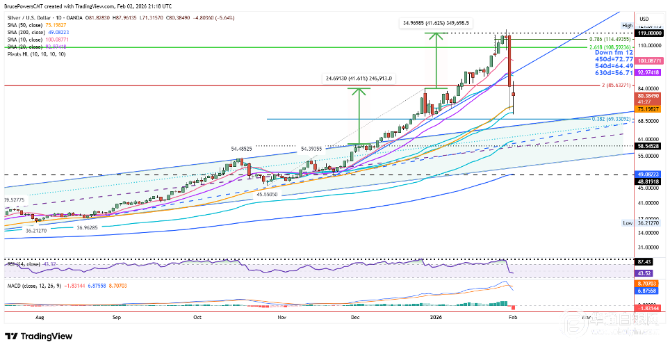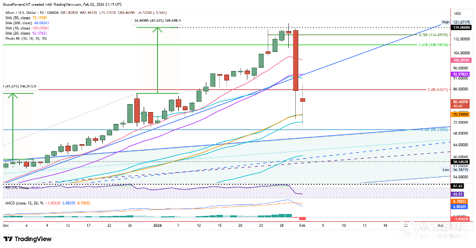 周五白银的高低点波动区间高达37.6%,这为价格在明确方向前提供了宽幅震荡空间。今日白银测试了周线区间的下沿并成功守住,继而引发反弹。价格发现过程或将推动银价测试当前位于100美元的10日均线阻力位。但在日线收盘未能站稳20日均线之前,预计上涨动能将遭遇强烈压制,从而导致价格进一步下探50日均线附近的支撑区域。