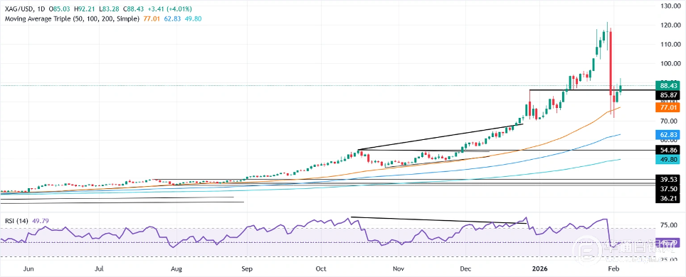 银价连续第二天持续上涨,涨幅达3.75%,尽管美国公布稳健经济数据后美元普遍走强,但白银走势未受其影响。截至撰写本文时,白银价格为88.20美元,此前曾从每日低点83.28美元反弹。
