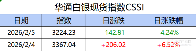 华通白银现货指数CSSI走势日报,今日指数3224.23,日涨跌-142.81,日涨跌幅-4.24%