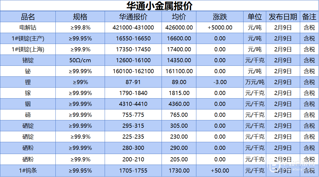 华通白银网 2月9日讯:电解钴、1#镁锭(生产)、1#镁锭(上海)、锗锭、铋、锂、镓、铟、碲、硒锭(99.99%)、硒锭(99.9%)、硒粉、硒粉(99.9%)、1#钨条报价