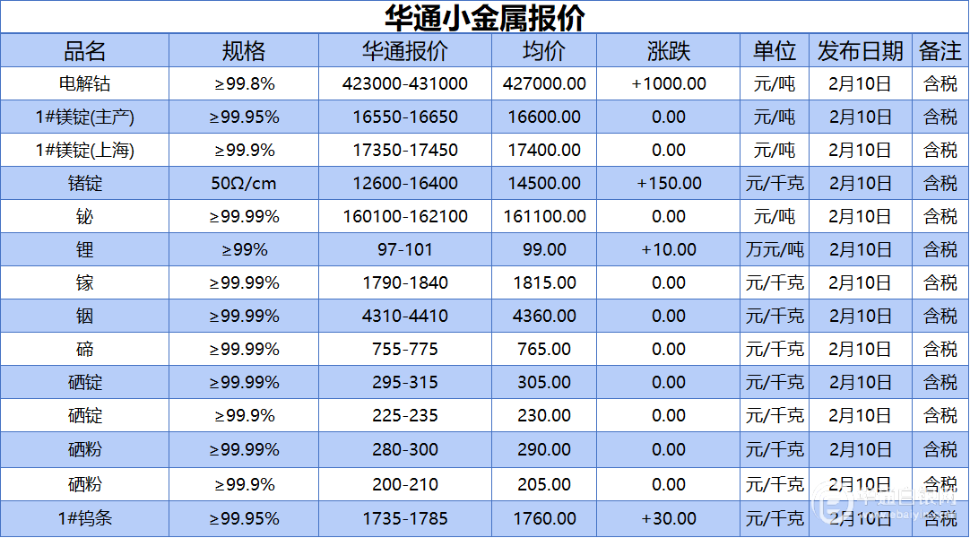 华通白银网 2月10日讯:电解钴、1#镁锭(生产)、1#镁锭(上海)、锗锭、铋、锂、镓、铟、碲、硒锭(99.99%)、硒锭(99.9%)、硒粉、硒粉(99.9%)、1#钨条报价