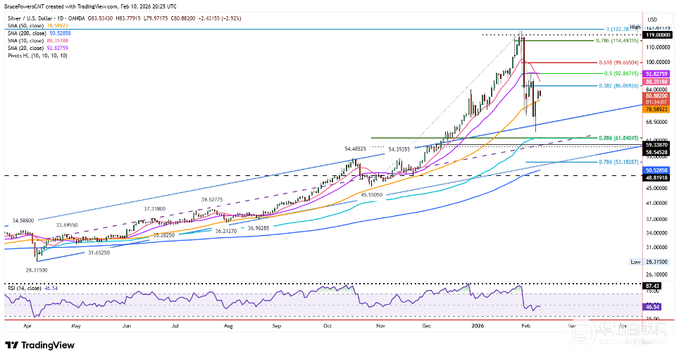 上周的低点完成了通道突破后的首次回撤。由于前期阻力位已转化为支撑位,这确认了长期看涨趋势。若通道上沿能持续作为支撑区域,则属于看涨信号。下一个关键决策区间可能出现在86.07美元附近,即1月高点以来完整跌势的38.2%斐波那契回撤位构成的阻力区域。鉴于20日均线已被验证过一次阻力作用,该均线或将在较长时间内继续发挥阻力效果。