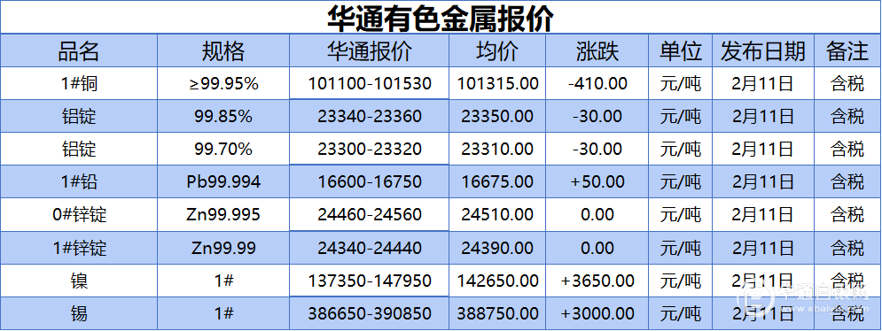 华通白银网 2月11日讯:1#铜、铝锭(99.85%)、铝锭(99.70%)、1#铅、1#锌、0#锌、镍、锡报价