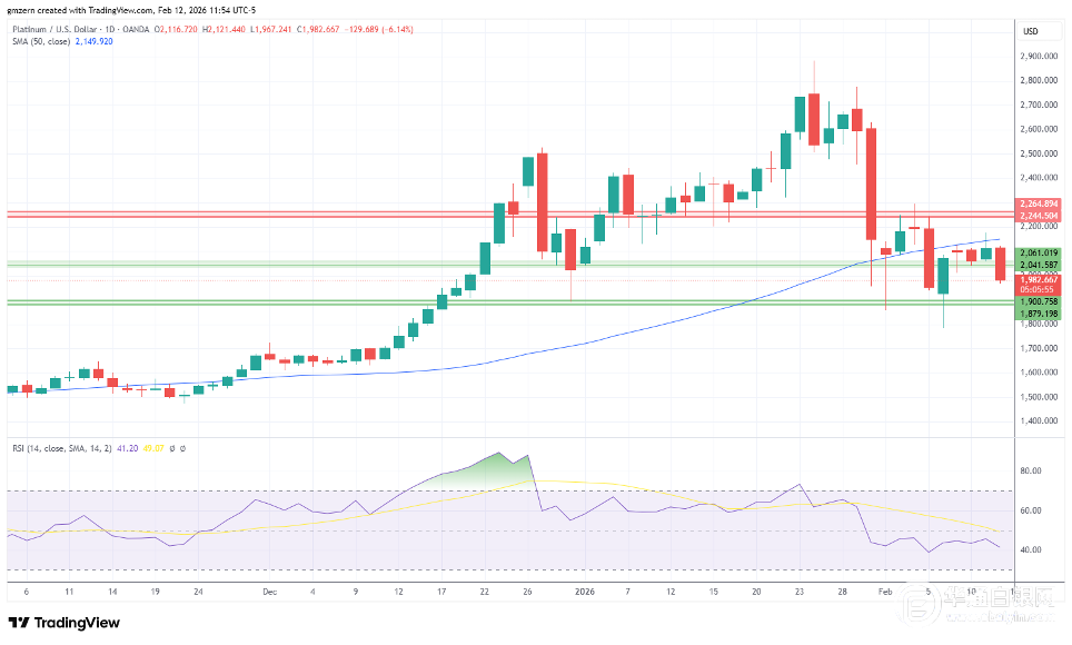 铂金价格试图回落至最近的支撑位区间2040-2060美元之下。若此次尝试成功,铂金价格将向下一个支撑位区间1880-1900美元迈进。